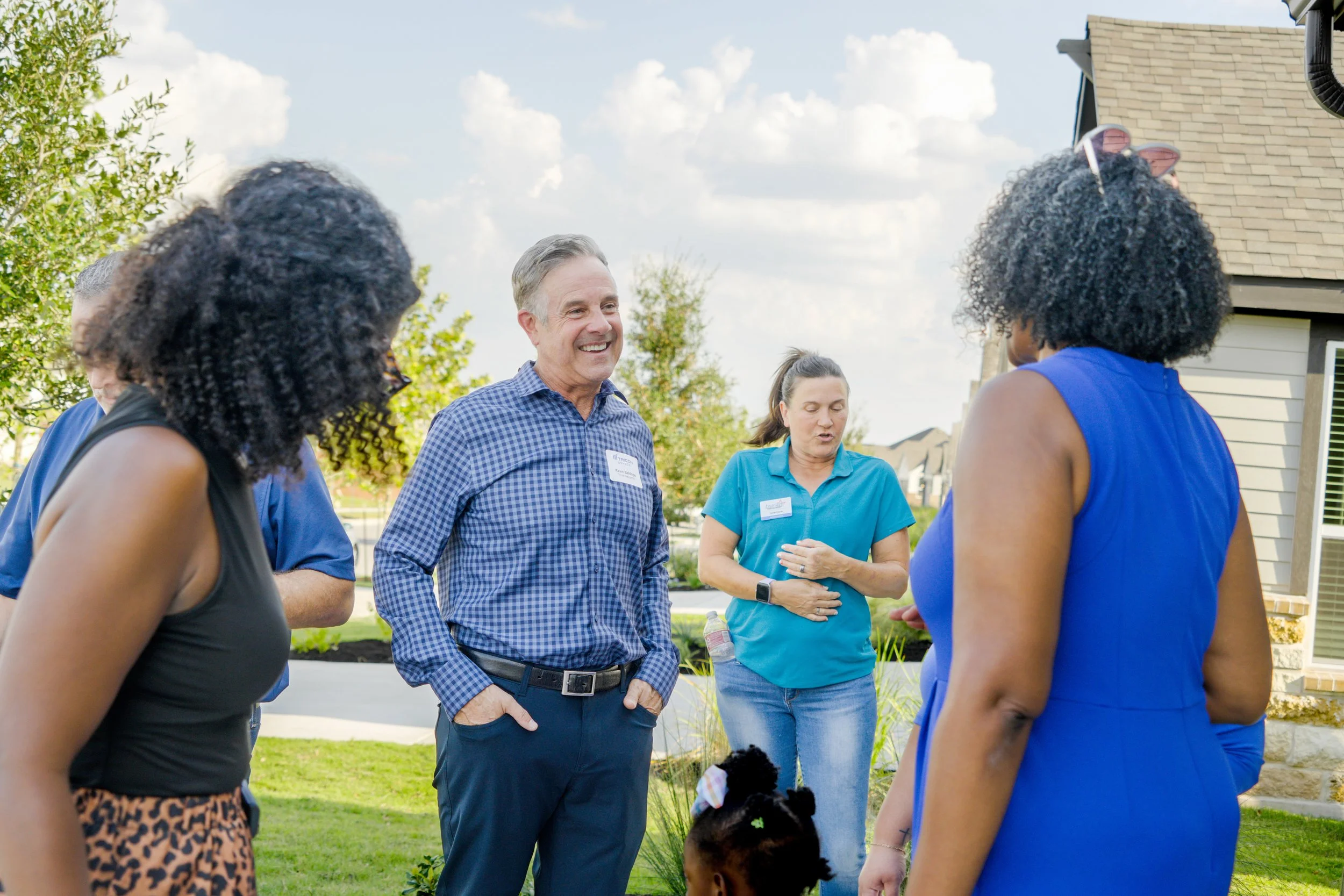 Kevin Baldridge of Tricon Residential speaking with homeowners at new community opening in Austin TX 2025 View fullsize